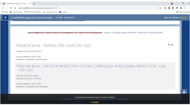 Once inside the lesson area, you will see a link to access to the virtual classroom (lesson of the day) and you will have access to the materials (e.g. slides that the professor will upload in due time) and to the recorded lessons.